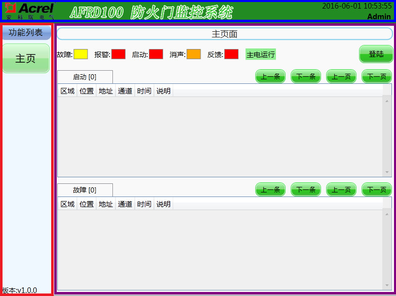 包含“登陸”按鈕、“界面標(biāo)題”、“功能列表”、“系統(tǒng)狀態(tài)欄”四部分組成,可以快速查詢當(dāng)前監(jiān)控狀態(tài),也可用于工作人員登錄操作。
