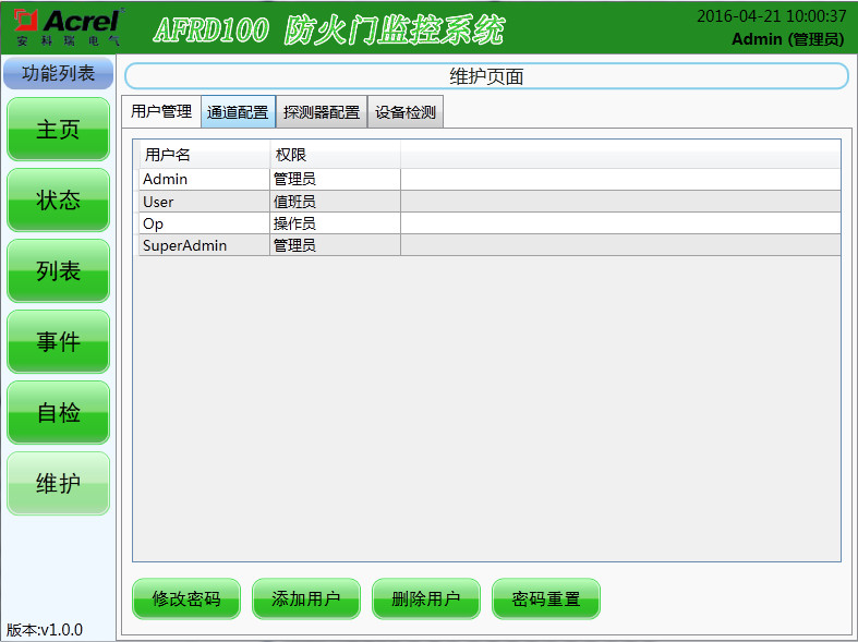 該界面設(shè)有三種操作級別,操作權(quán)限級別依次為“超級管理員”→“管理員”→“操作員”,其中高級別可添加低級別的新用戶。