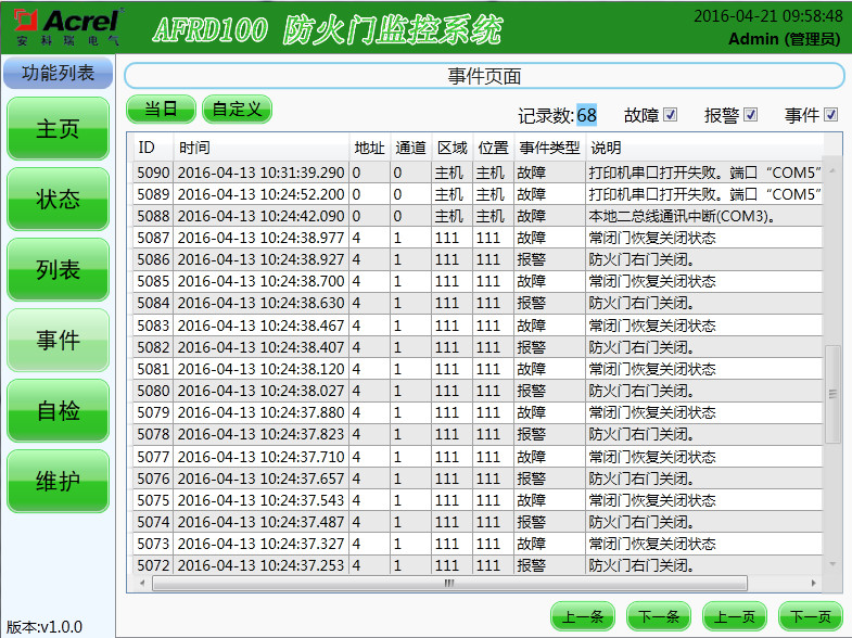 該界面可顯示當(dāng)前存儲的報警記錄、故障記錄和事件記錄,可選擇查詢當(dāng)天記錄也可以自定義查詢?nèi)掌凇?/div>