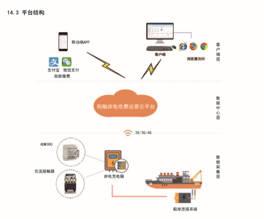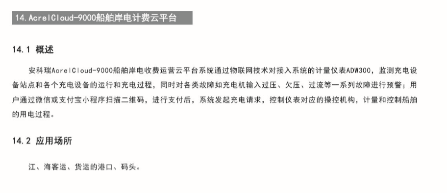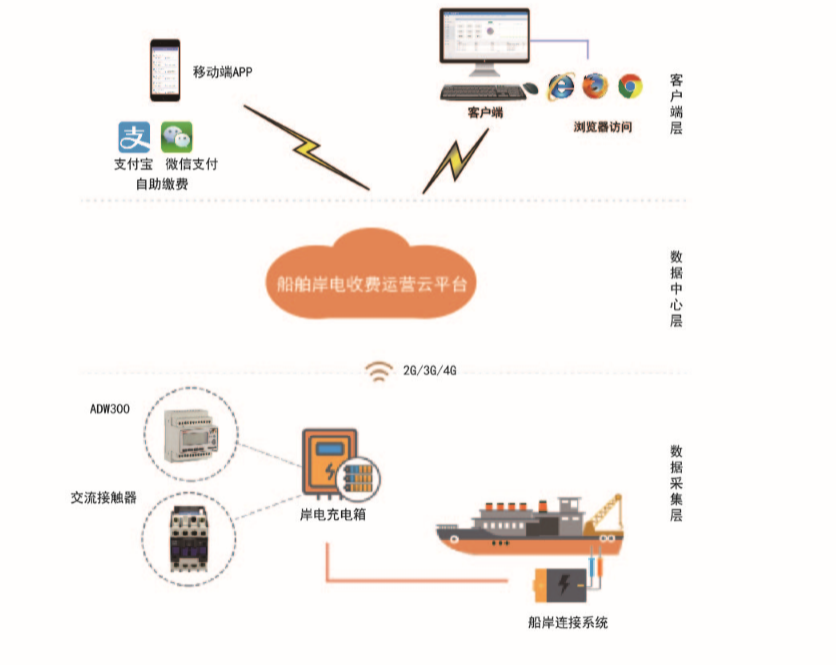 安科瑞AcrelCloud-9000船舶岸電收費運營云平臺系統通過物聯網技術對接入系統的計量儀表ADW300,監測充電設備站點和各個充電設備的運行和 充電過程,同時對各類故障如充電機輸入過壓、欠壓、過流等一系列故障進行預警;用戶通過微信或者支付寶小程序掃描二維碼,進行支付后,系統發起充電請求,控制儀表對應的操控機構,計量和控制船舶的用電過程。